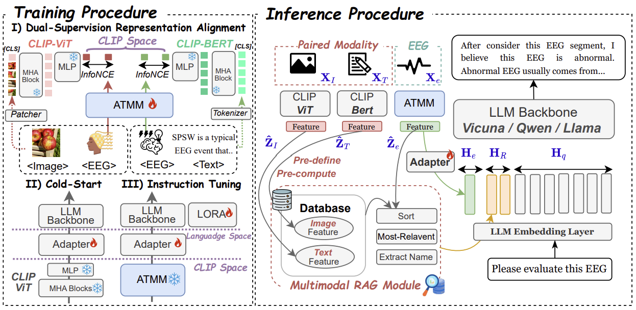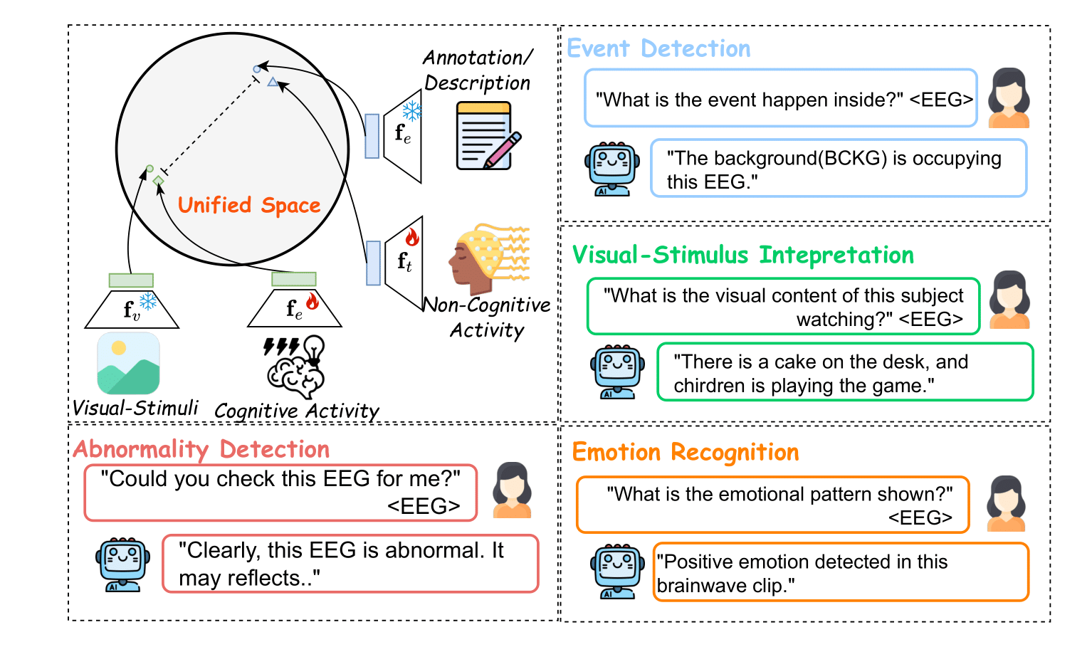• Multi-Stage Training and Performance: We propose a three-stage training scheme to fully unlock the model’s ability to recognize and understand EEG. The model performs well in classification tasks and has initially acquired the ability to open question answering.