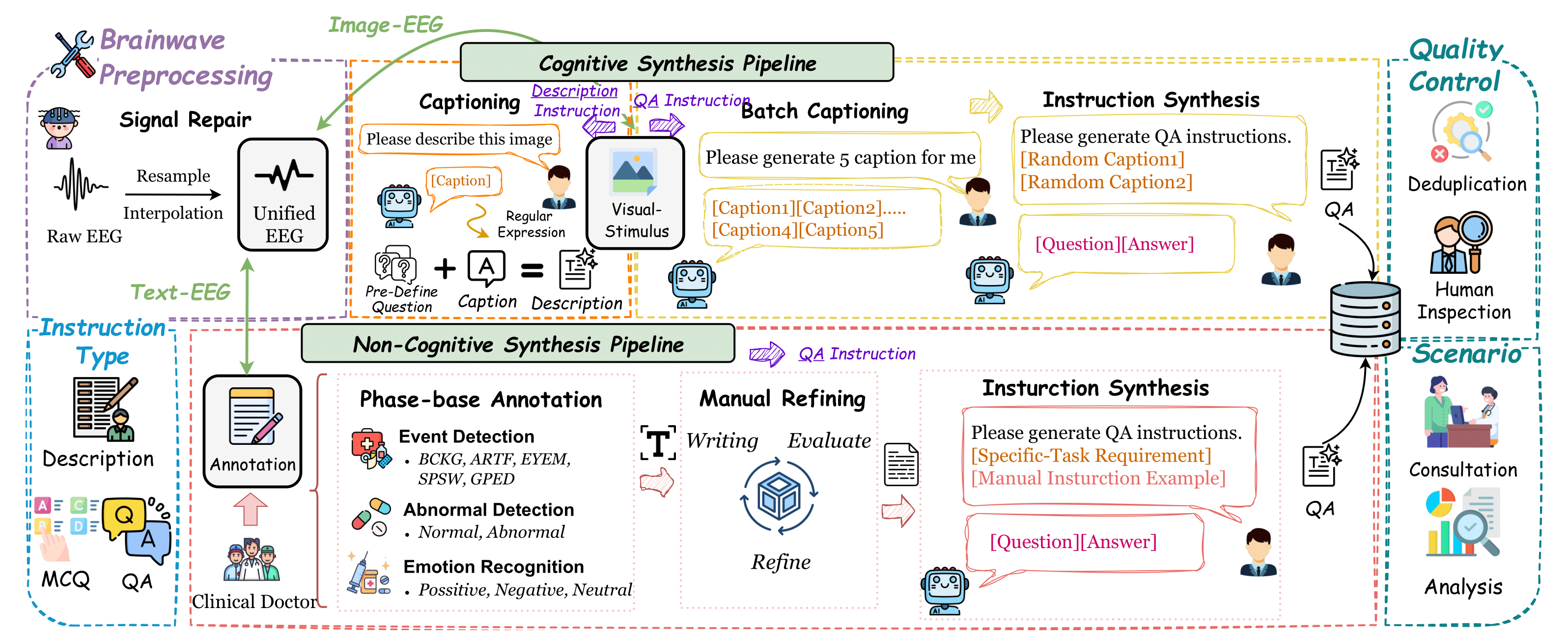 • Comprehensive Dataset and Benchmark: We synthesized WaveMind-Instruct, the first cross-task instruction dataset comprising 4 instruction-tuning types and 2 chat scenarios, along with WaveMind-Bench, which contains 12K MCQs, to facilitate evaluation of EEGMLLMs.